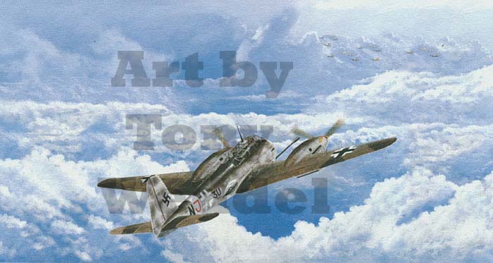 lone Me-410 Hornet prepares to engage a flight of Boeing B-17s.